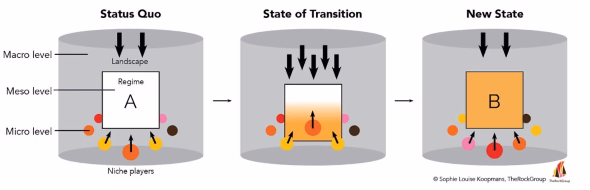 We use science based thinking of a school of thought called ‘Transition Theory’. Researchers working within this domain study large societal transitions and try to understand how to influence, steer and accelerate transitions.